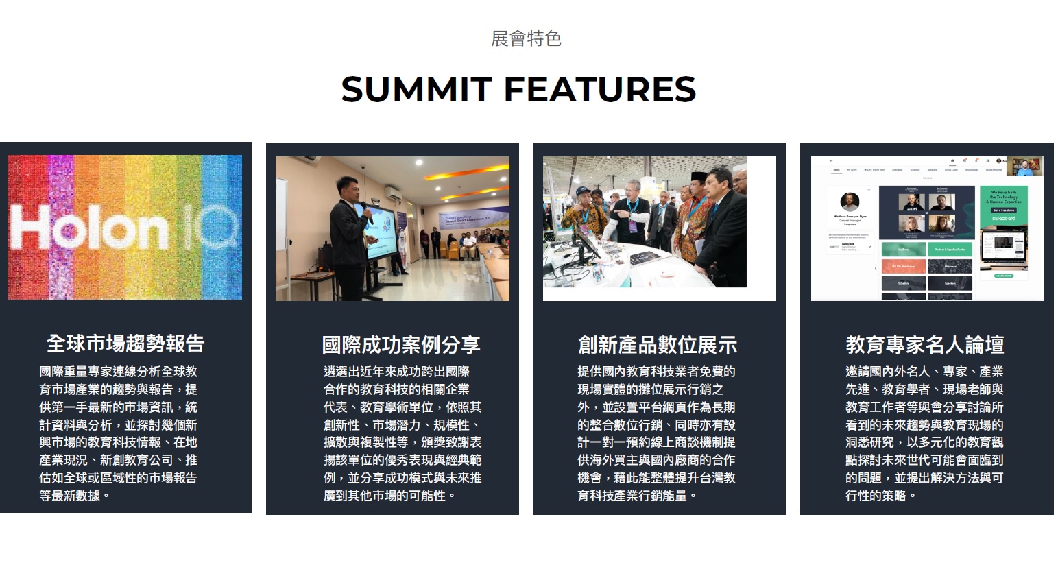 全球市場趨勢報告、分享國際成功案例、創新產品數位展示、教育專家名人論壇等